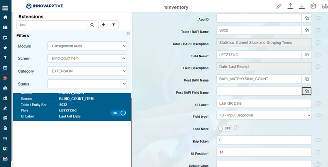 Field Description Module Name Consignment Audit Screen Name Blind Count Item Category Extension Table/BAPI Name S032 Table/BAPI Description Statistics: Current Stock and Grouping Terms Field Name LETZTZUG Field Description Date: Last Receipt Post BAPI Name BAPI_MATPHYSINV_COUNT UI Label Last GR Date Field Type ID – Input Dropdown UI Position 14 Active ON Overview ON Detail ON Mandatory ON Dropdown Table S032 Dropdown Field LETZTZUG DD Dependency Field MATNR.WERKS.LGORT -