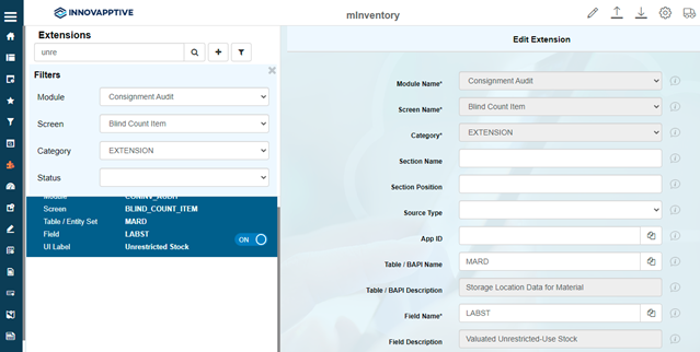 Field Description Module Name Consignment Audit Screen Name Blind Count Item Category Extension Table/BAPI Name MARD Table/BAPI Description Storage Location Data for Material Field Name LABST Field Description Valuated Unrestricted-Use Stock Post BAPI Name BAPI_MATPHYSINV_COUNT UI Label Unrestricted Stock Field Type LF – Label Field UI Position 21 Active ON Overview ON Detail ON Mandatory ON Parent Key MATNR.WERKS.LGORT -