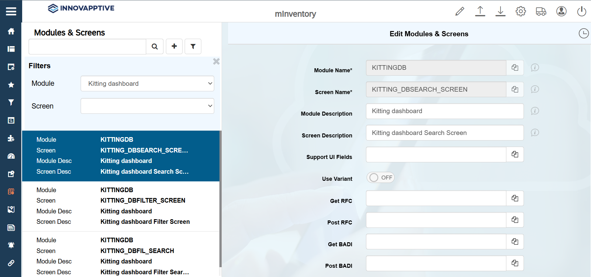 Field Description Module Name KITTINGDB Screen Name KITTING_DBSEARCH_SCREEN Module Description Kitting dashboard Screen Description Kitting dashboard Search Screen -