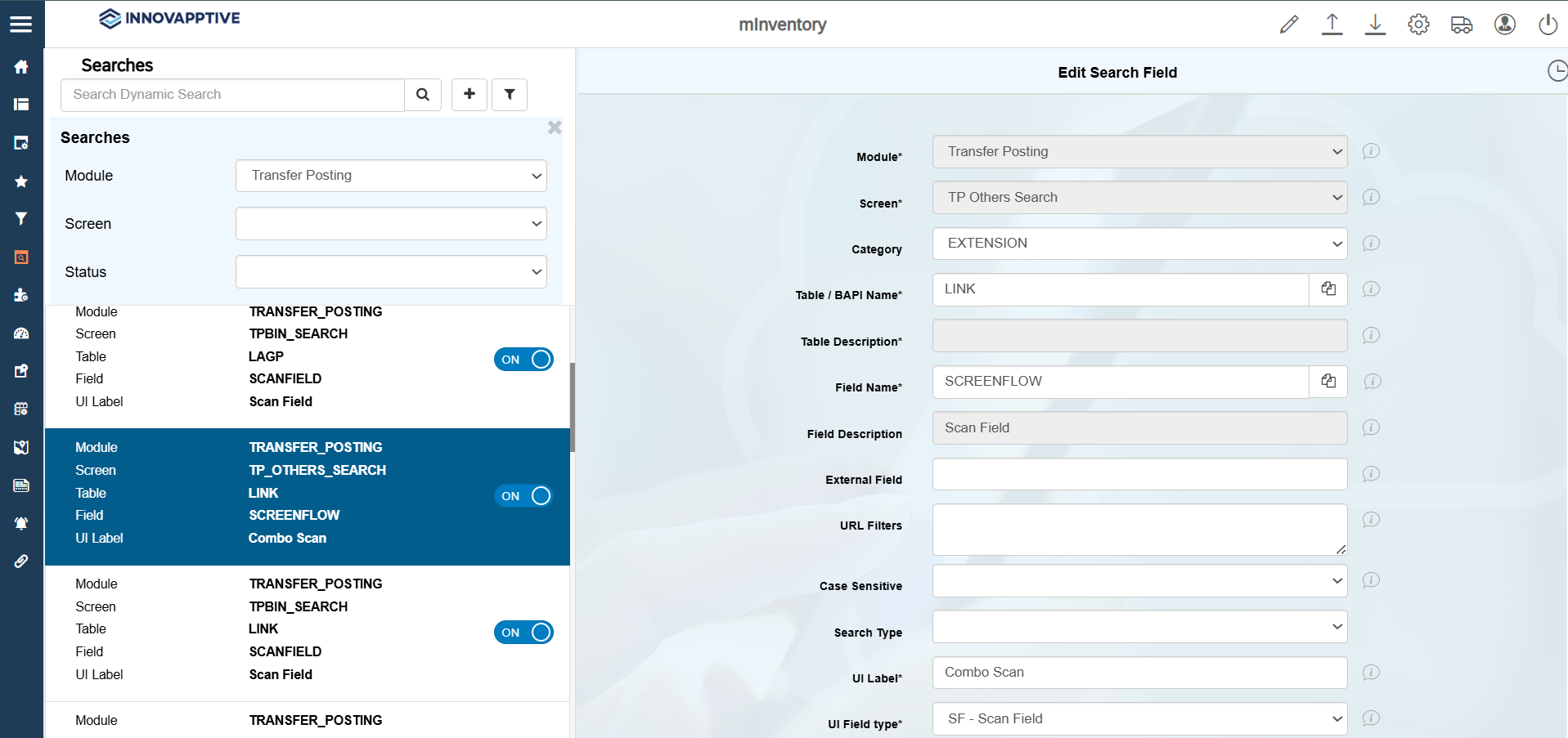 Field Description Module Required module Screen Required screen (e.g., TP Others Search) Table / BAPI Name LINK Field Name SCREENFLOW UI Label Combo Scan UI Field type SF – Scan Field UI Position 1 Default Value { "SCREENFLOW": { "SEARCHSCREEN": { "OPTIONAL": "" }, "ITEMSCREEN": { "OPTIONAL": "" }, "SUCCESSSCREEN": { "SHOWSUBNAVIGATION": true, "NAVIGATIONS": { "APP045": true, "APP200":true } } }}Active ON - Click Save.