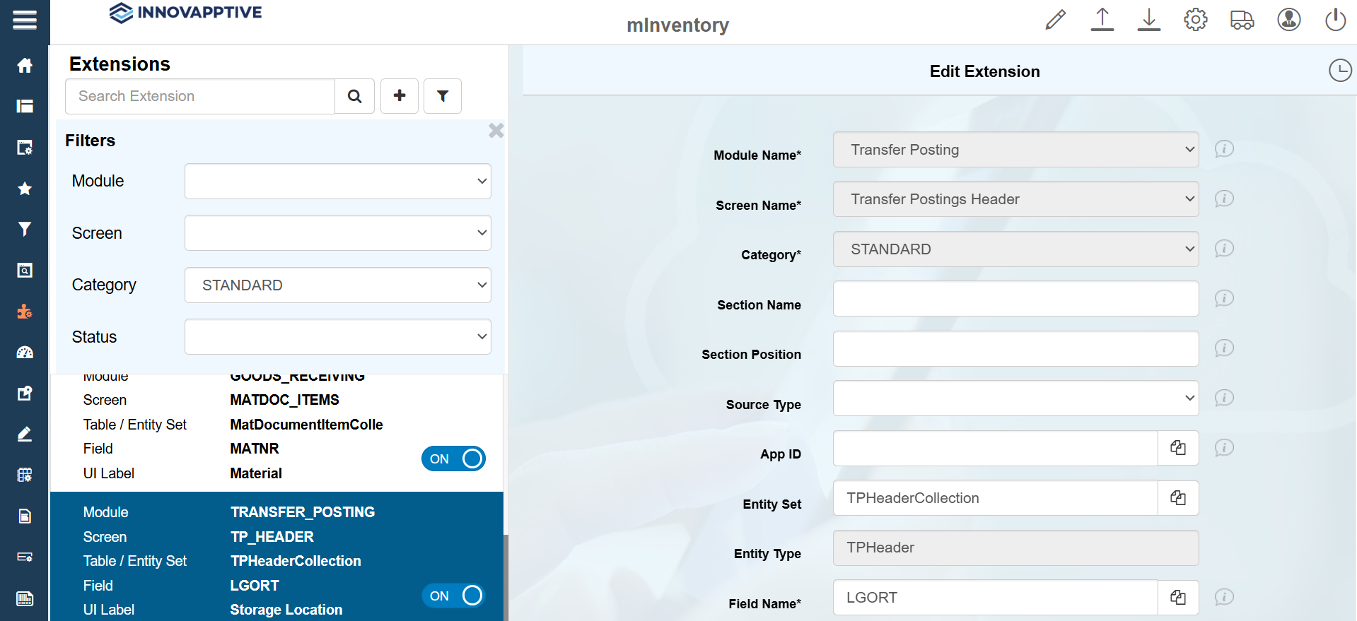 Field Description Module Name Transfer Posting Screen Name Transfer Postings Header Category Standard Entity Set TPHeaderCollection Entity Type TPHeader Field Name LGORT UI Label Storage Location Field Type ID – Input Dropdown UI Position 4 Case Sensitive Upper Case Active ON Overview ON Detail ON Mandatory OFF -
