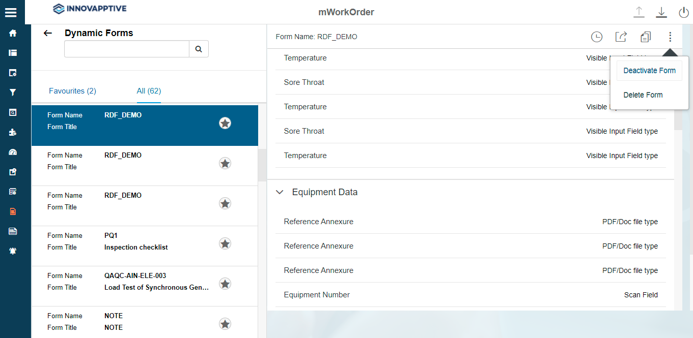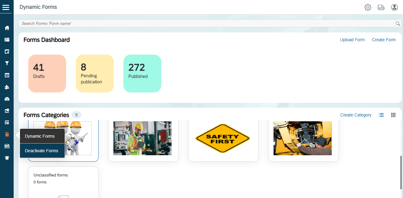 - Click the Dynamic Forms button on the left panel and click the Deactivate Forms option to see the list of deactivated forms.