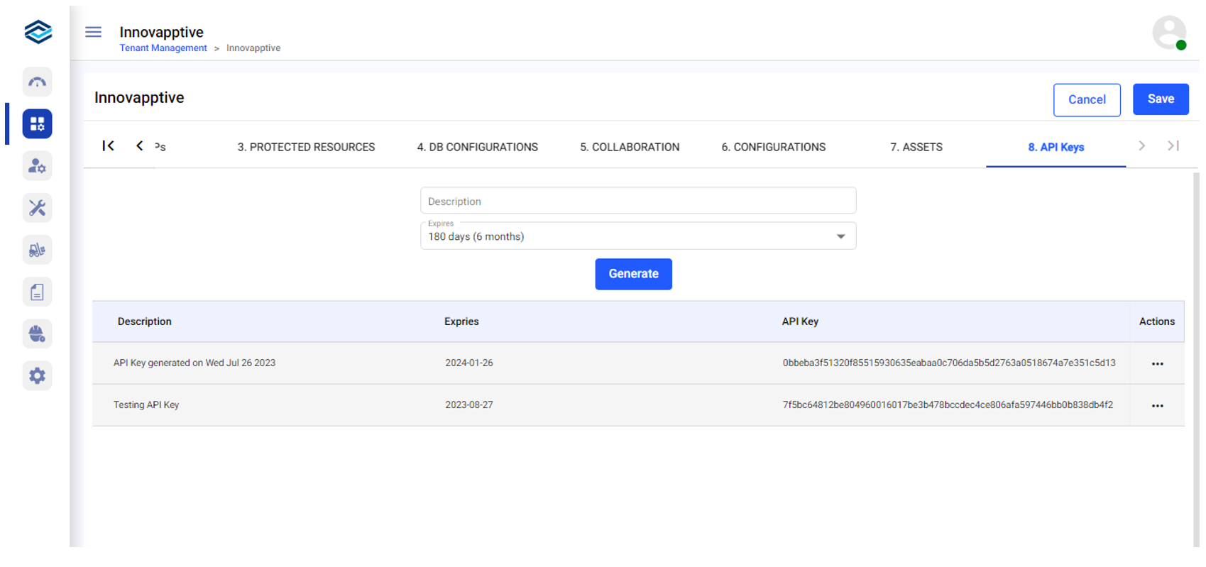 - Expires: Select the API Key expiration duration, such as 30 days, 90 days, 180 days, or 365 days, from the drop-down.