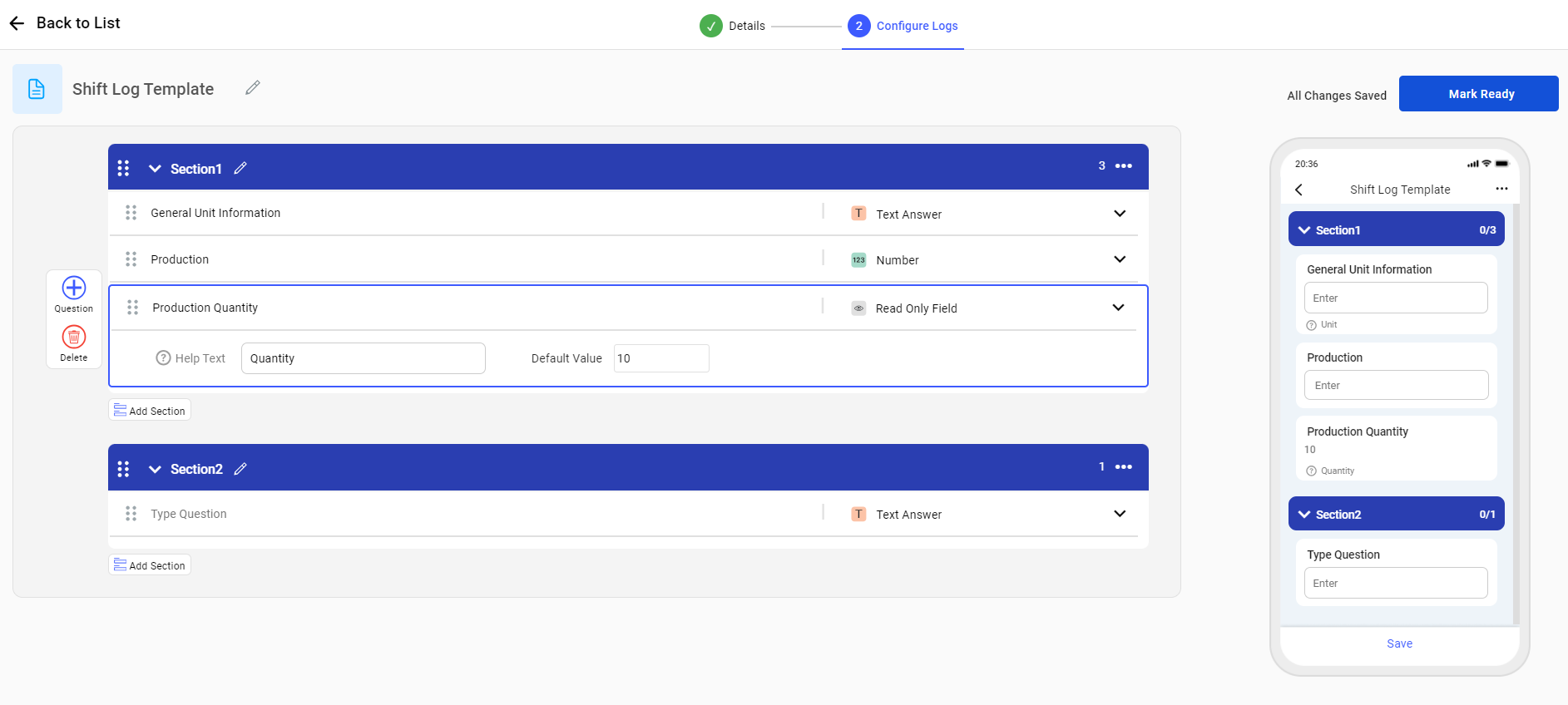 The shift log template is created successfully and you can view it in the Log Templates screen with Ready status.
