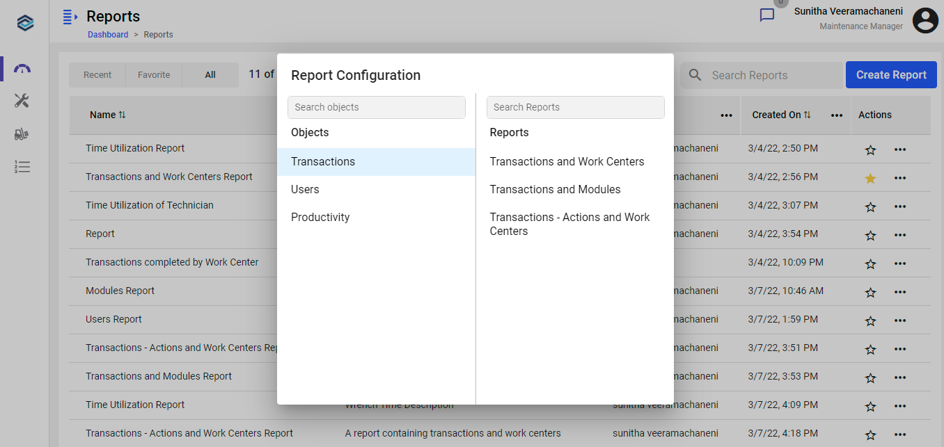 You can create a report for different types of transactions such as location based transactions, work center based transactions, and so on.
