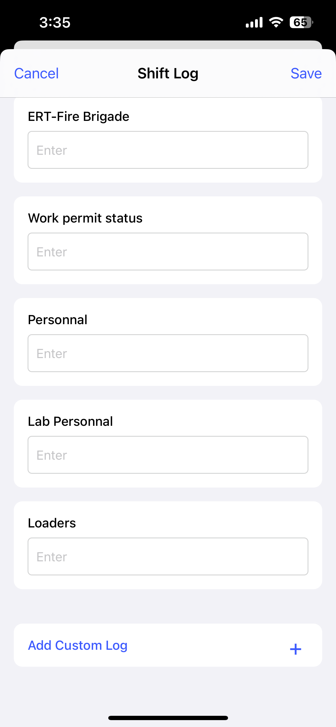 Note:You can also create the shift log in the following ways,- In the More screen, tap Shift Logs, select log entry, tap the Add icon to add the shift log.