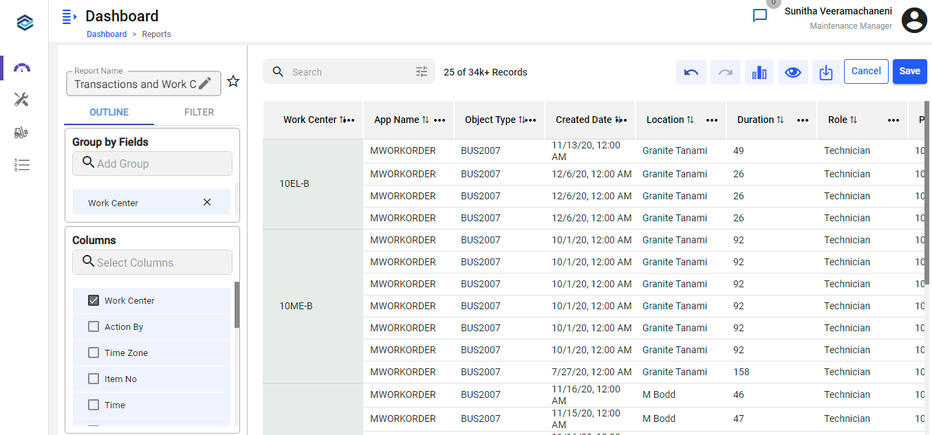 - Select the Objects such as Transactions, Users, or Productivity on the left side.
