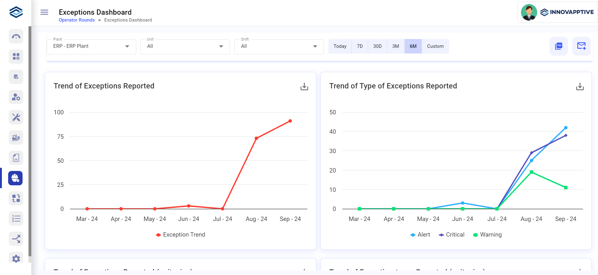 - Filter the reports based on Plant, Unit, Shift, Today, 7 Days, 30 Days, 3 Months, 6 Months, and Custom.