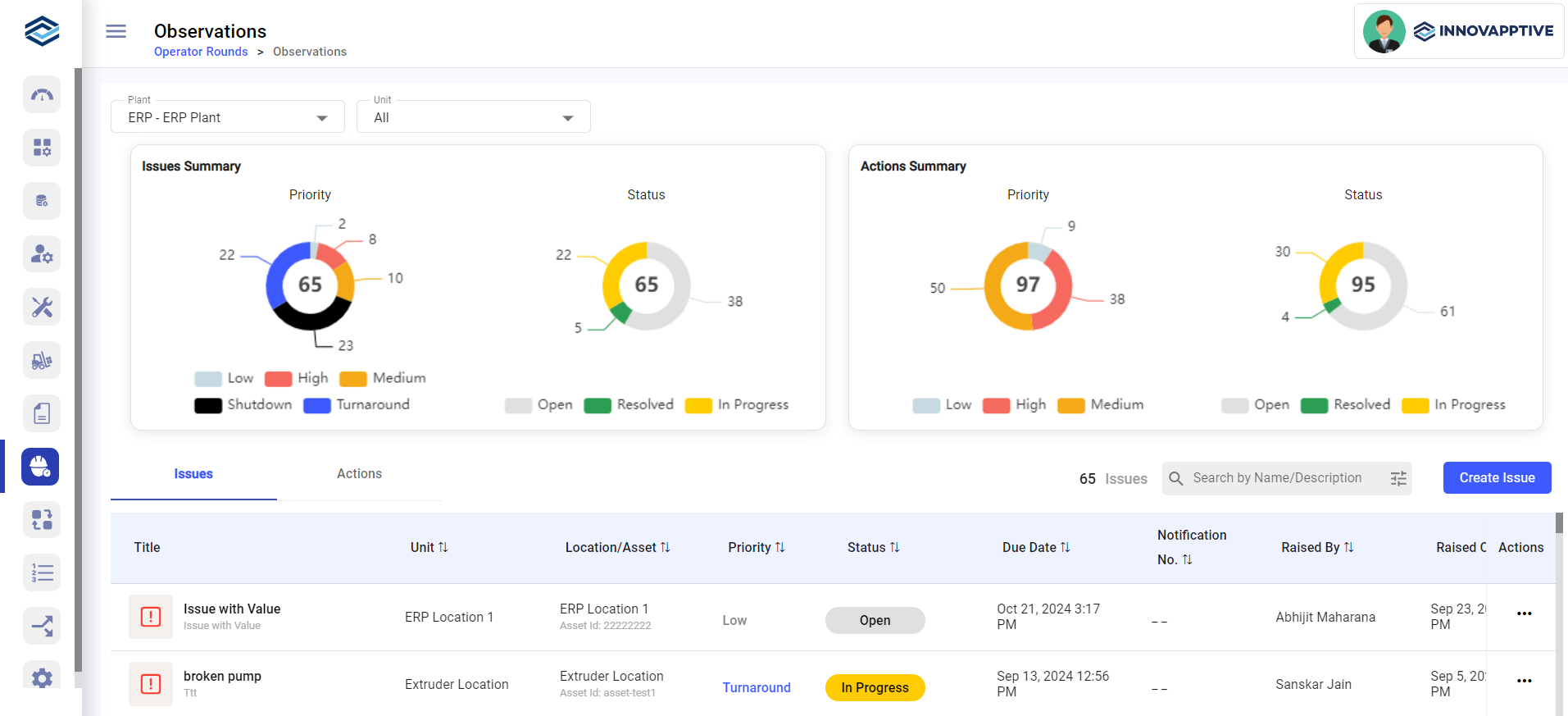 The Observations dashboard graphically represents Open Issues information in doughnut charts, categorized by their priority and status. You can filter issues by Plant and Unit.