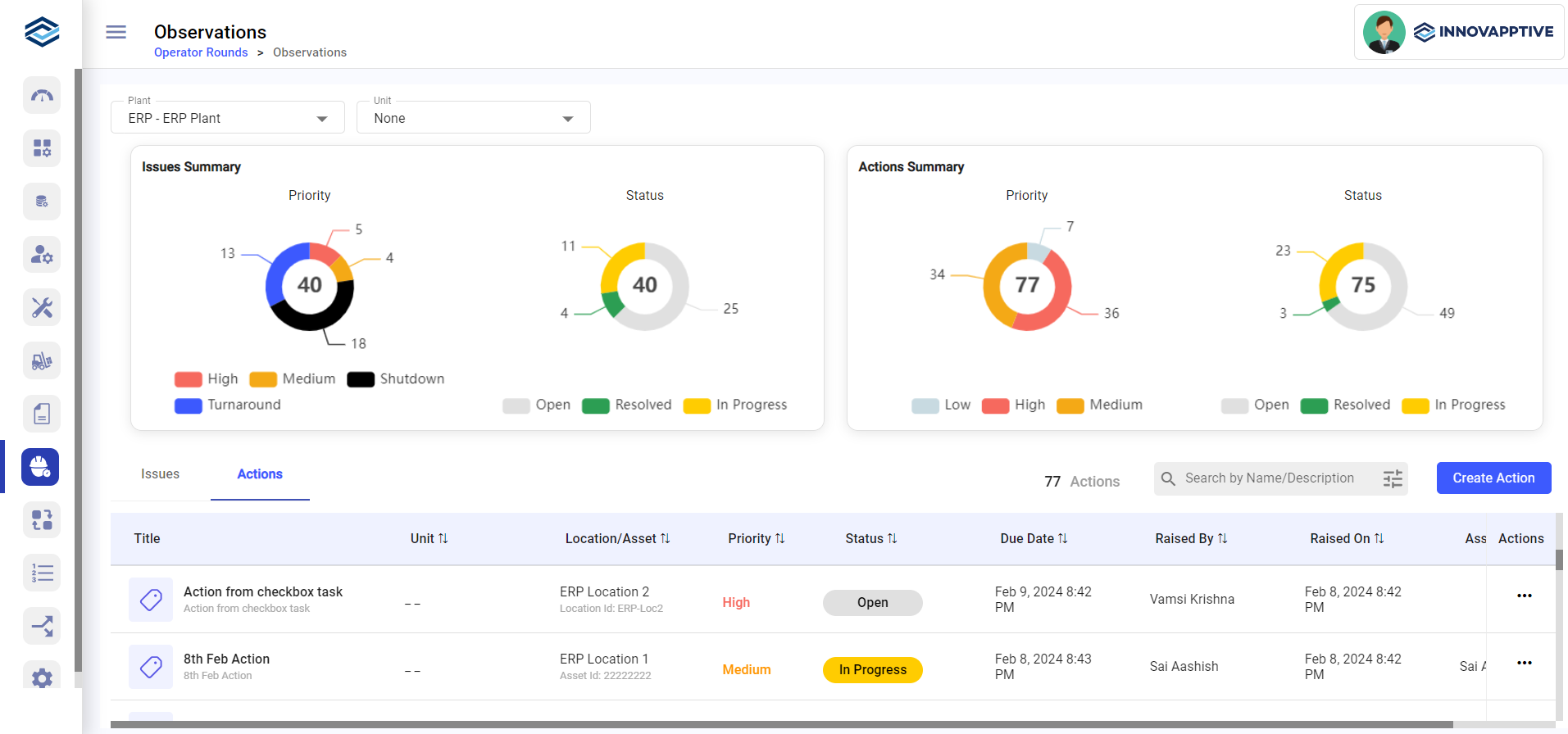 Creating actions helps you and operators address issues identified during inspections or rounds. These actions serve as follow-up tasks, ensuring critical issues receive prompt attention and are systematically tracked to resolution. This process aids in maintaining equipment performance and minimizing downtime, contributing to smoother operations.