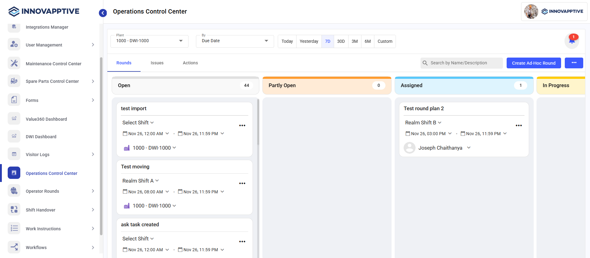 The Rounds tab displays all planned and ad hoc rounds in a status-wise board. This helps supervisors track round progress and quickly identify overdue or skipped tasks.