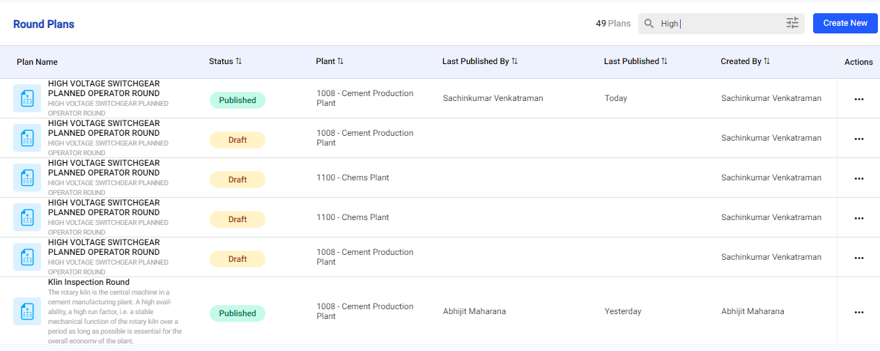 You can search for created, published (scheduled and unscheduled), archived round plans, issues, and actions from their respective screens.