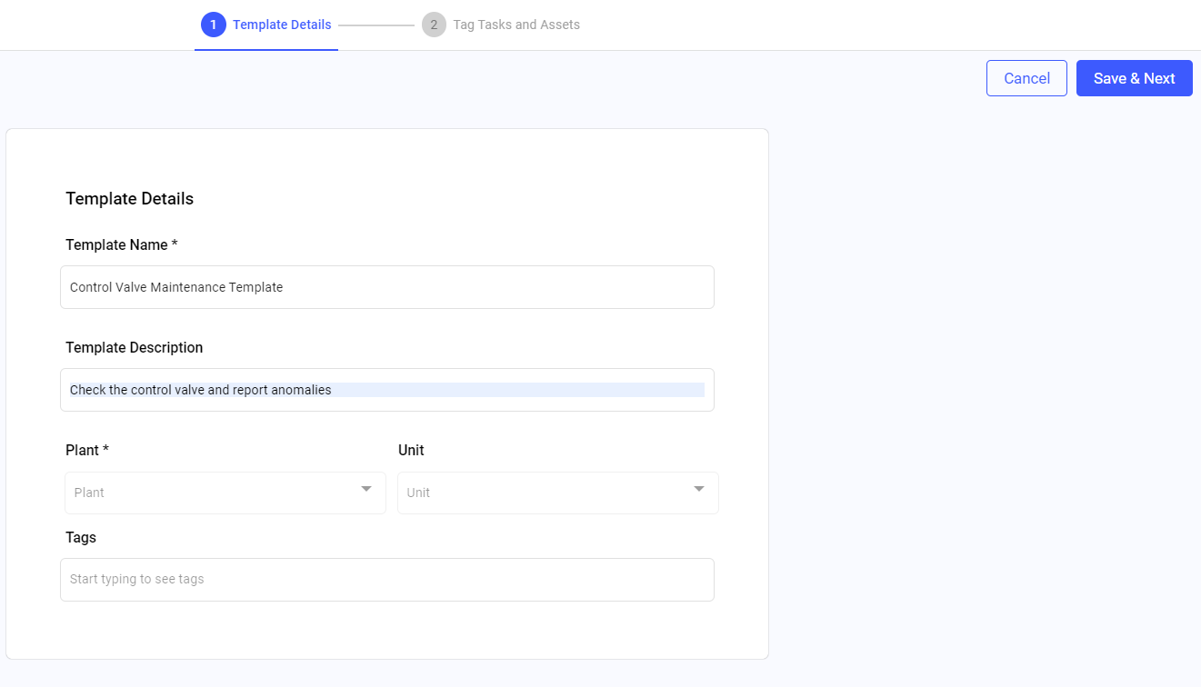 Table 1. Fill Template Details Field Description Template Name Enter a name of the template. For example, Asset Maintenance Template. Template Description Add a short description about the template. Plant Select a relevant plant from the drop-down. Unit Select a relevant unit from the drop-down. Tags Add relevant tags. Figure 1. Templates Details Screen