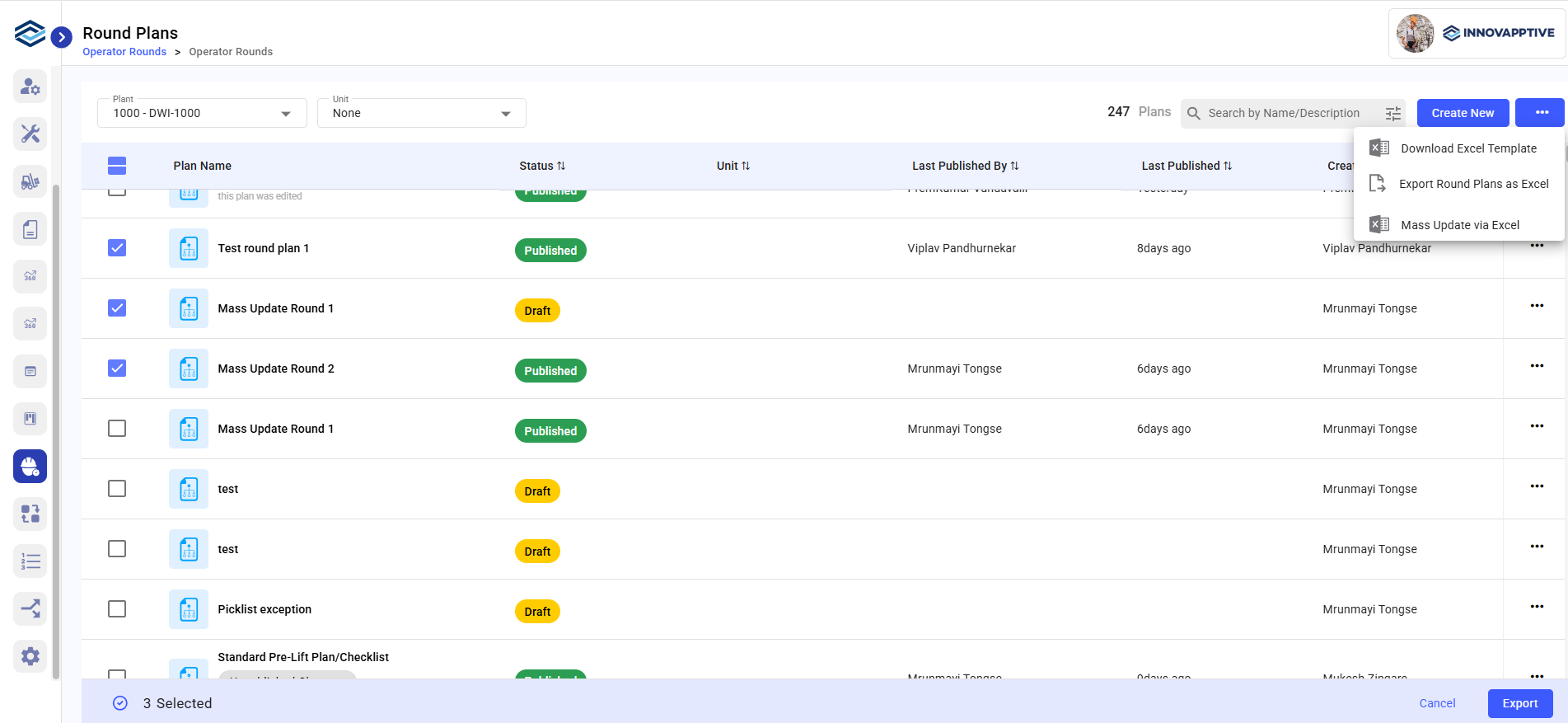 You can export existing round plans to Excel and update them in bulk. This helps reduce effort when you need to make a large number of updates when new assets, route changes, are updated or component updates, or logic changes happen.