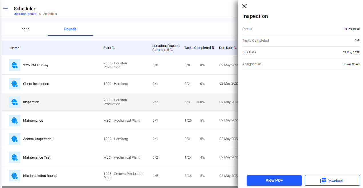 For example, you can view the Control Valve Maintenance Round Plan to check which tasks have been completed, which are pending, and whether operators have encountered any issues during execution. This helps you maintain a clear overview of the health of your equipment and processes.