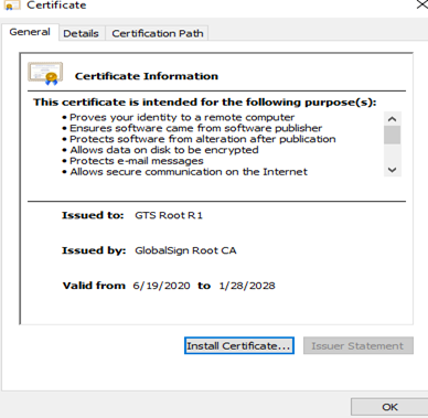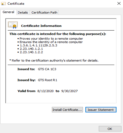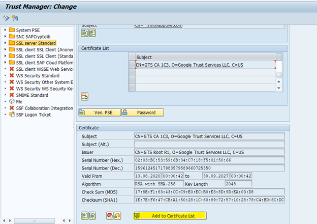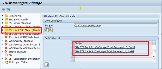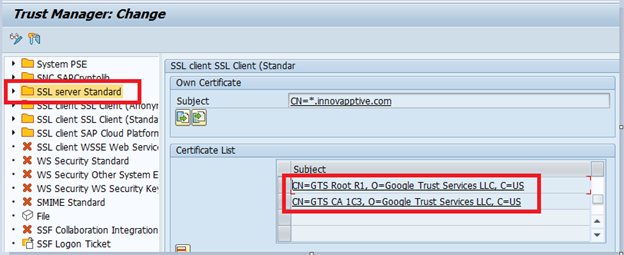 The GTS CA 1C3 and GTS Root R1 certificates are successfully added to SSL Server Standard.Figure 4. Certificates are Added to SSL Server Standard