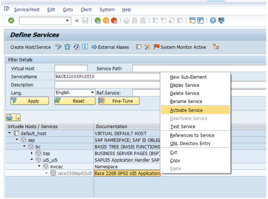Right-click RACE 2208 SP02 UI5 and click Activate Service.