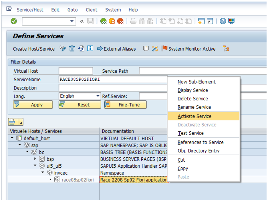 - Go to the transaction code SICF and navigate to /default_host/sap/bc/ui5_ui5/invcec/race08sp02fiori.