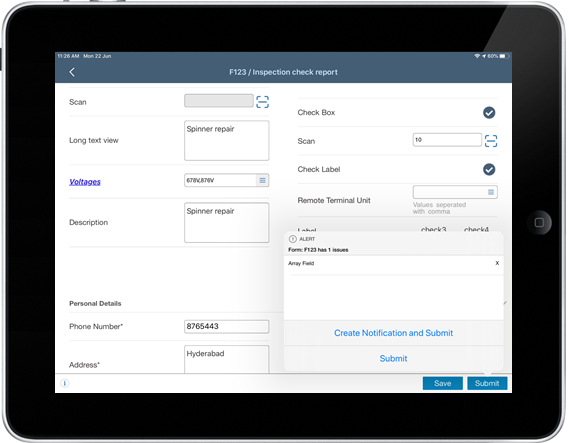 On a scheduled basis, you can create an instance (entry) of the form and post your observations. When working on your tasks if you identify an inconsistency, you can raise a Notification from the form. This feature can be enabled using RACE. See Trigger business object from form using validations section in the Configure mWorkOrder using RACE document.
