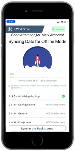 - If you have chosen the Online option, Sync in the Background button appears and you can tap that and continue with your work. The data downloads onto your device in the background while you do your tasks.