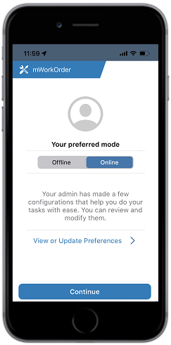 - In the Tell Us Your Preferences screen, tap Online or Offline depending on the internet connectivity of the location where you will be working.