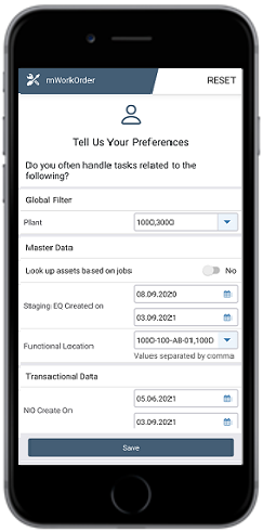 Use the View/Update preferences option to choose and download Master data (equipment and functional location details) and Transactional data (notifications, work orders, etc.) that you need to complete your tasks for the day.