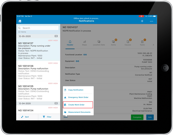 Header tab, tap and then tap Create Work Order.