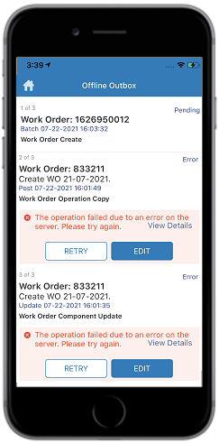 For example, when you modify and post a work order, the record is stored in Offline Outbox. These changes are synchronized with backend systems when you tap the online button. If the transactions have errors, they remain in the Offline Outbox. Open these transactions from Offline Outbox, correct the errors, and repost them.