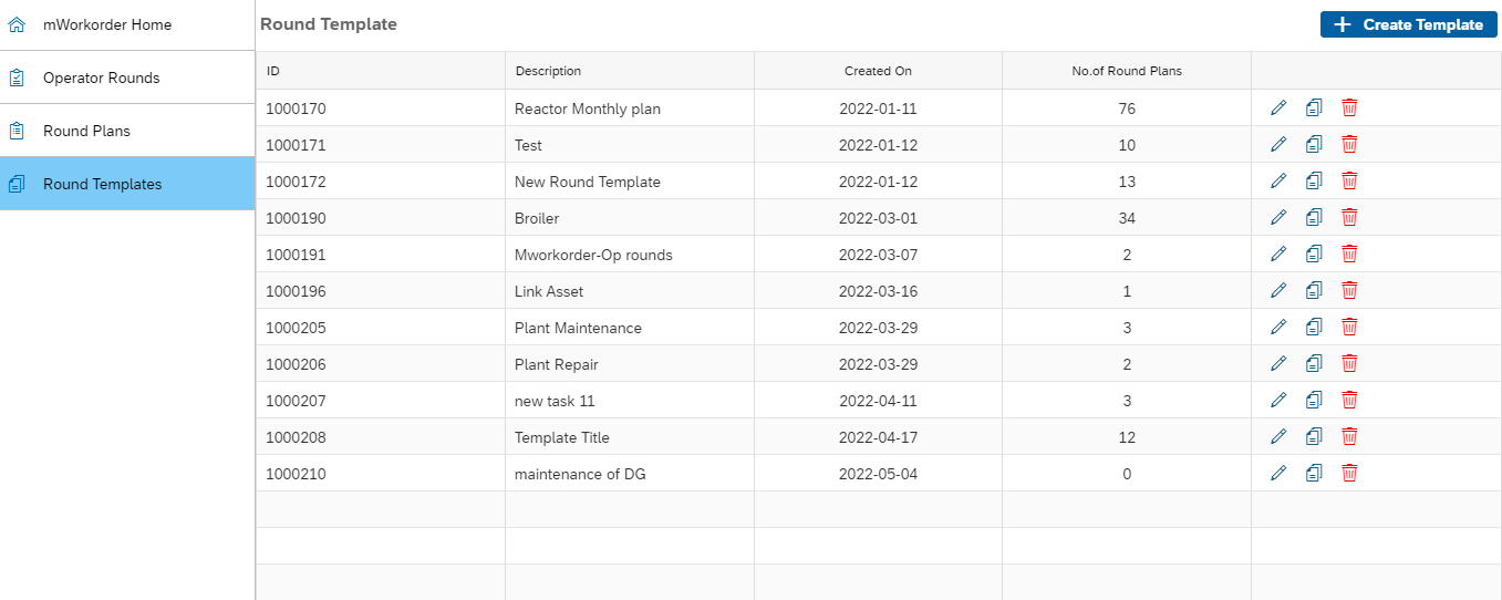 In this screen you can,- Sort and filter templates by ID, Description, Created On (sort only), No. of Round Plans.