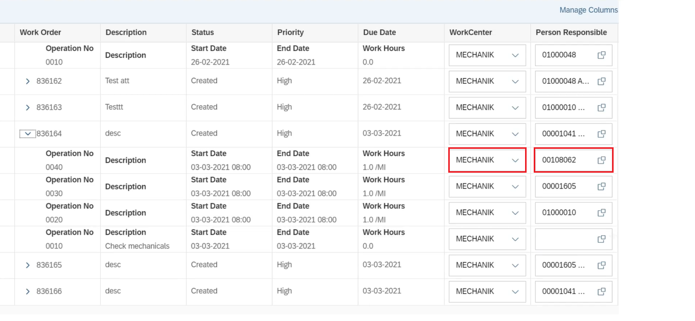 Use the Schedule Work Orders module of the UI5 application to assign work center personnel to jobs (Work Order or Work Order operations).