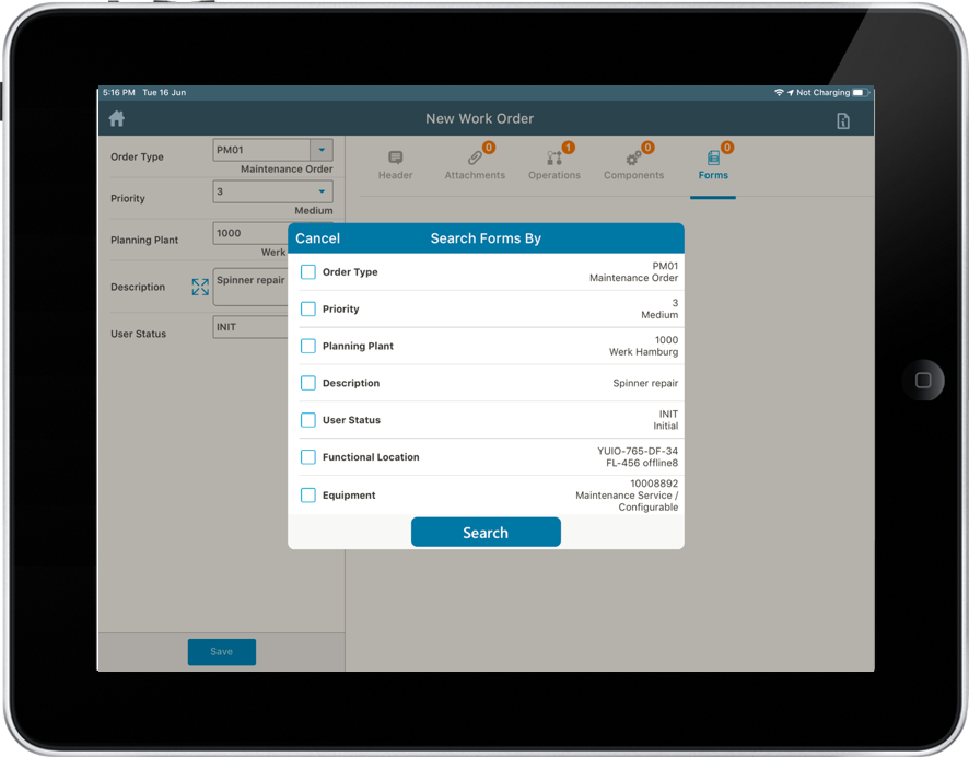 For example, when your Supervisor assigns you a Work Order you might be required to fill up forms such as checklist and inspection entry form. Depending on the Work Order tasks, you can modify the Work Order and add relevant forms. On the Forms tab, you can:
