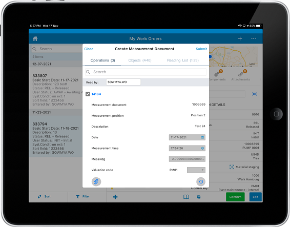 You can create a measurement document for Measuring Points in Operations, Objects, and Reading List for the work order from the operation detail screen while confirming the operation.