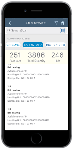 Note:To view particular material details, enter or scan the Material Number field and tap Search.The overview of stock is displayed in the selected warehouse.