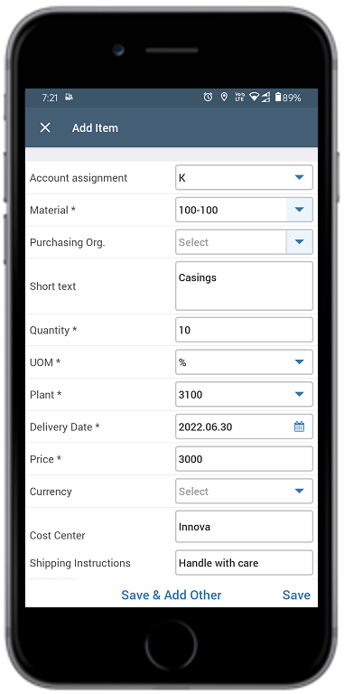 Based on the selected value in the Account Assignment field, the respective fields such as Cost Center, Order, or WBS Element are displayed to add the details.