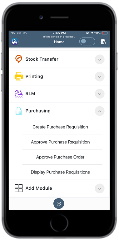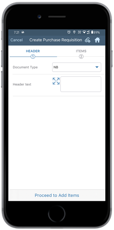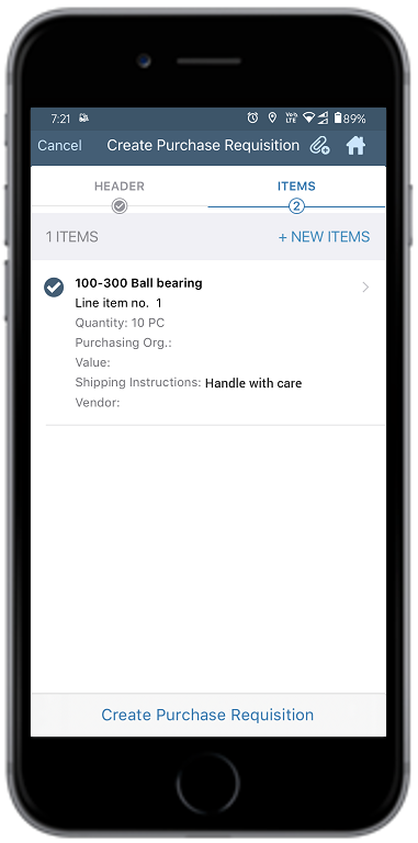 A message appears that the Purchase Requisition is created successfully.Tap Display Purchase Requisitions in the Home screen to view the created purchase requisition details.