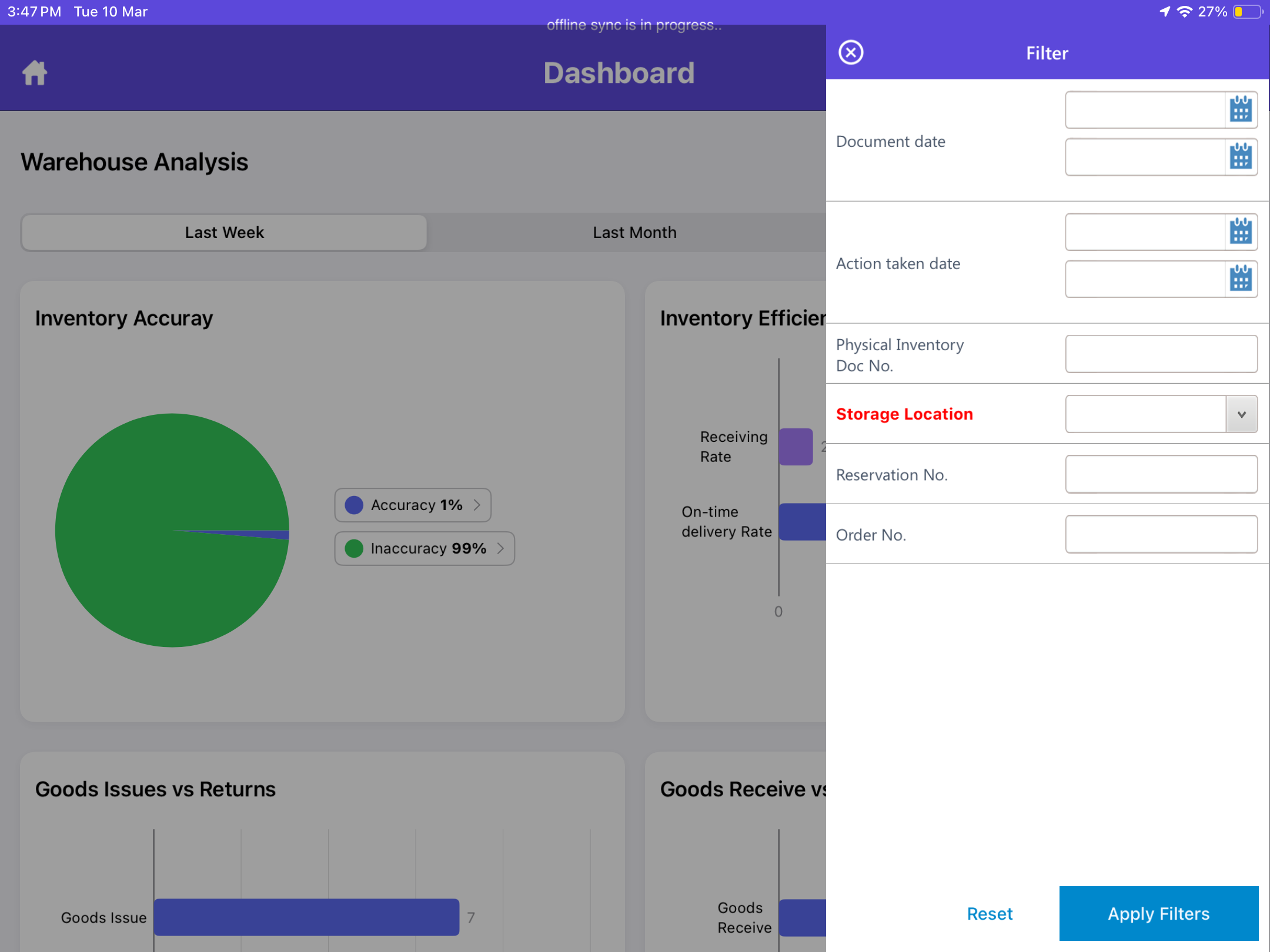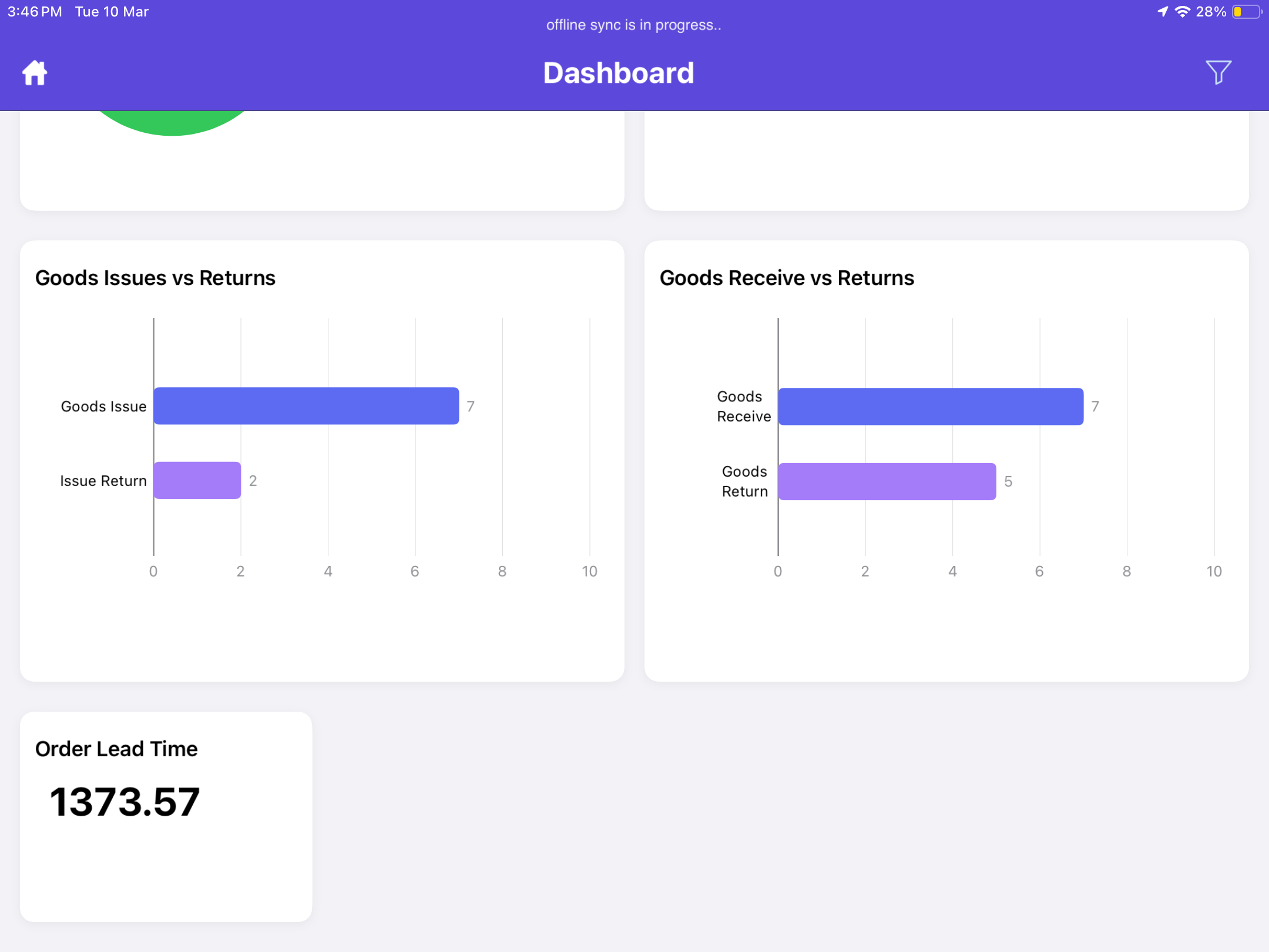 The Warehouse Analytics Dashboard in the mInventory application provides a centralized, data-driven view of warehouse performance.