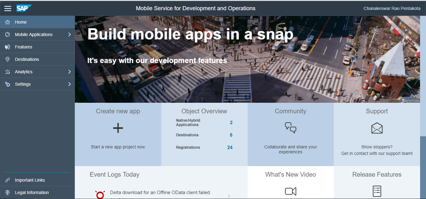 On login, you can view mobile landscape information such as number of applications configured, users connected, and device registrations.