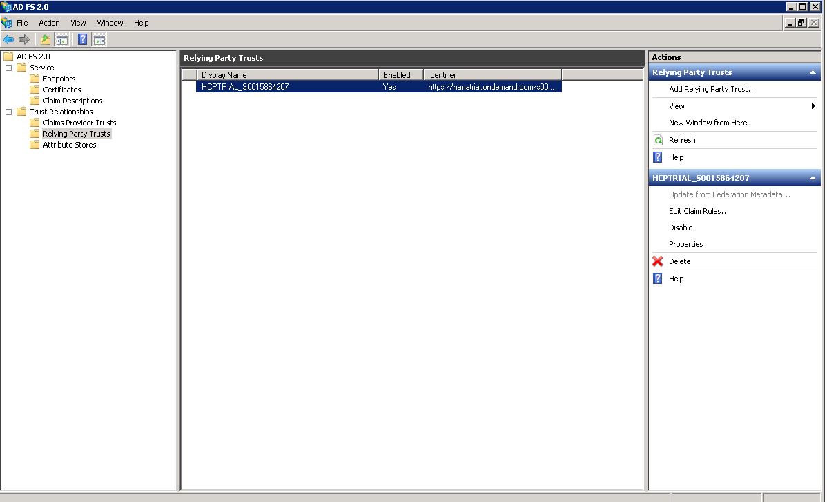 - Go to ADFS Management Console, select Relying Party Trusts and select the entry. In this case, it is SCPTRIAL_S00XXXXX.
