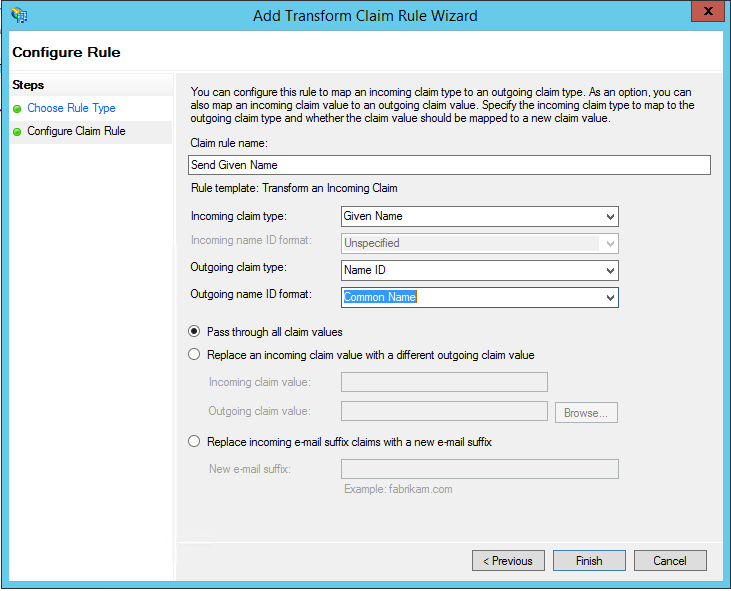 - Click Add Rule. This Claim Rule instructs ADFS to issue the user’s firstname, lastname, organizational ID, and employee ID as SAML Attributes (also known as “Claims”) in the response. (Options Configurations per the requirement).