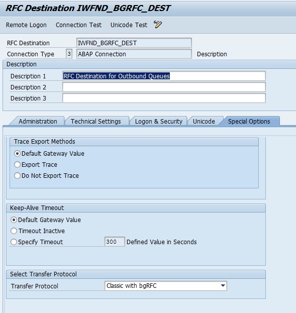 - Navigate to SAP NetWeaver, SAP Gateway, OData Channel, Configuration, Connection Settings, SAP NetWeaver Gateway to Consumer, Create RFC Destination for Outbound Queues.